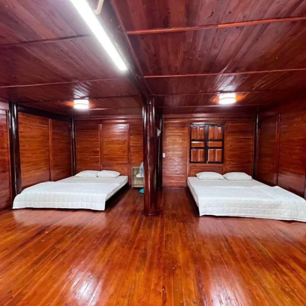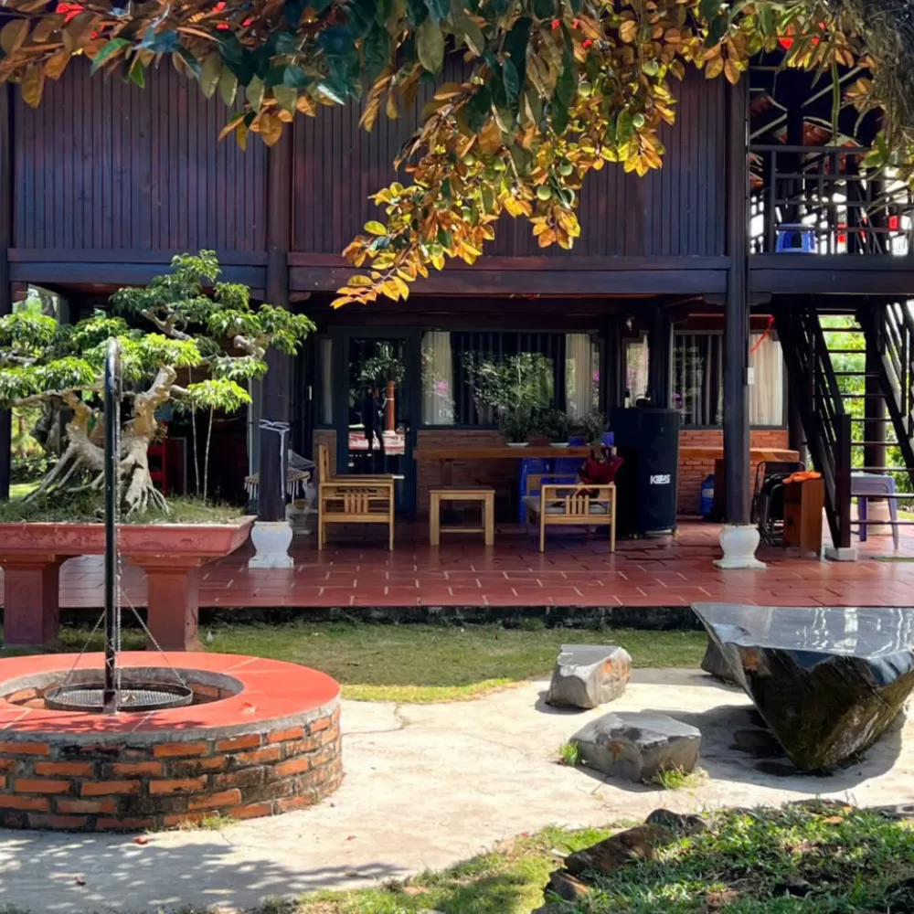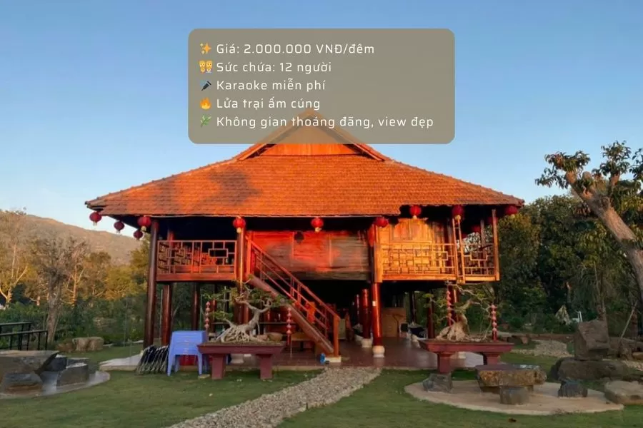 Nhà Gỗ Homestay mang đến không gian nghỉ dưỡng ấm cúng, đậm chất truyền thống với thiết kế nhà sàn bằng gỗ, mái ngói đỏ và khuôn viên xanh mát. Với giá 2 triệu đồng mỗi đêm, căn nhà có sức chứa 12 người, phù hợp cho nhóm bạn bè hoặc gia đình muốn trải nghiệm không gian mộc mạc, thoáng đãng. Homestay cung cấp dịch vụ karaoke miễn phí, giúp bạn tận hưởng những phút giây giải trí trọn vẹn. Khu vực sinh hoạt ngoài trời rộng rãi, lý tưởng cho tiệc tùng, quây quần bên nhau. Liên hệ ngay để đặt phòng và tận hưởng kỳ nghỉ đáng nhớ.